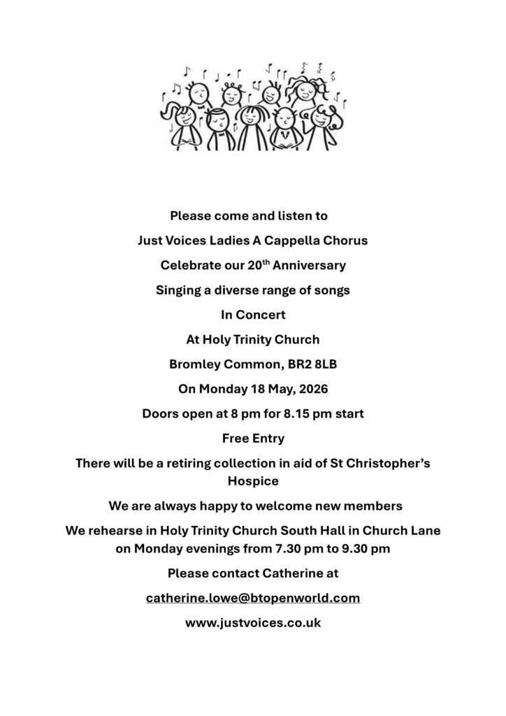 We are now recruiting singers, so if you enjoy singing why not come along to Holy Trinity Church, South Hall, Church Lane, Bromley Common, BR2 8LB and listen to us? We rehearse from 7.30 pm to 9.45 pm on a Monday evening. You don’t have to be able to read music, as teach tracks will be provided. You would be very welcome. Contact Catherine at catherine.lowe@btopenworld.com for more information.